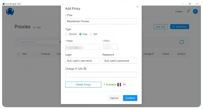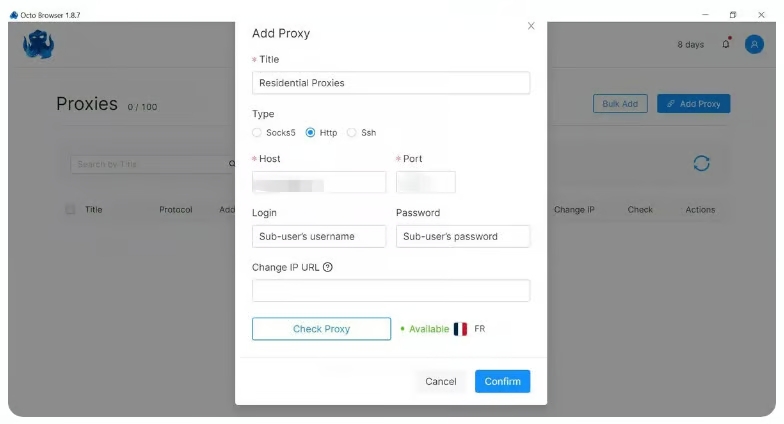 Accédez à la page de configuration du proxy et collez la chaîne de proxy que nous avons copiée depuis le tableau de bord Swiftproxy. Cliquez sur "check proxy", et si tout fonctionne, cliquez sur "confirm" pour terminer. Remarque : Vous pouvez trouver les informations de proxy requises à Step1.