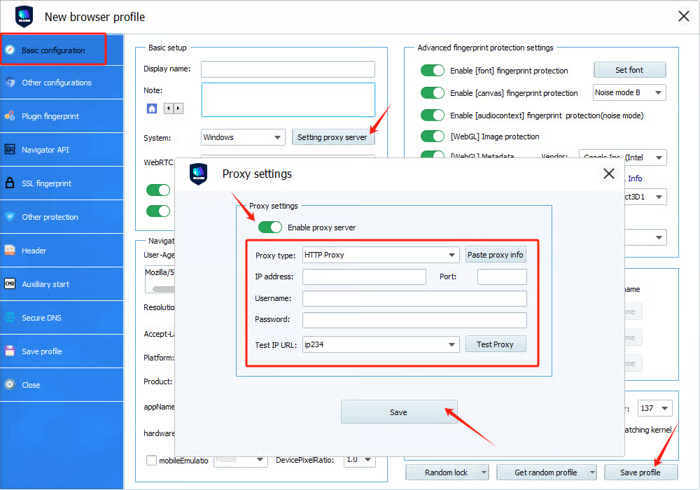 Pour configurer vos proxies, allez dans "Basic Configuration", cliquez sur "Setting proxy server", puis assurez-vous que "Enable proxy server" est activé. Copiez vos informations de proxy depuis le tableau de bord Swiftproxy vers VMLogin, puis cliquez sur "Save" pour finaliser la configuration. Cliquez ensuite sur "Save profile" pour enregistrer le profil. Remarque : Vous pouvez trouver les informations de proxy requises à Step1.