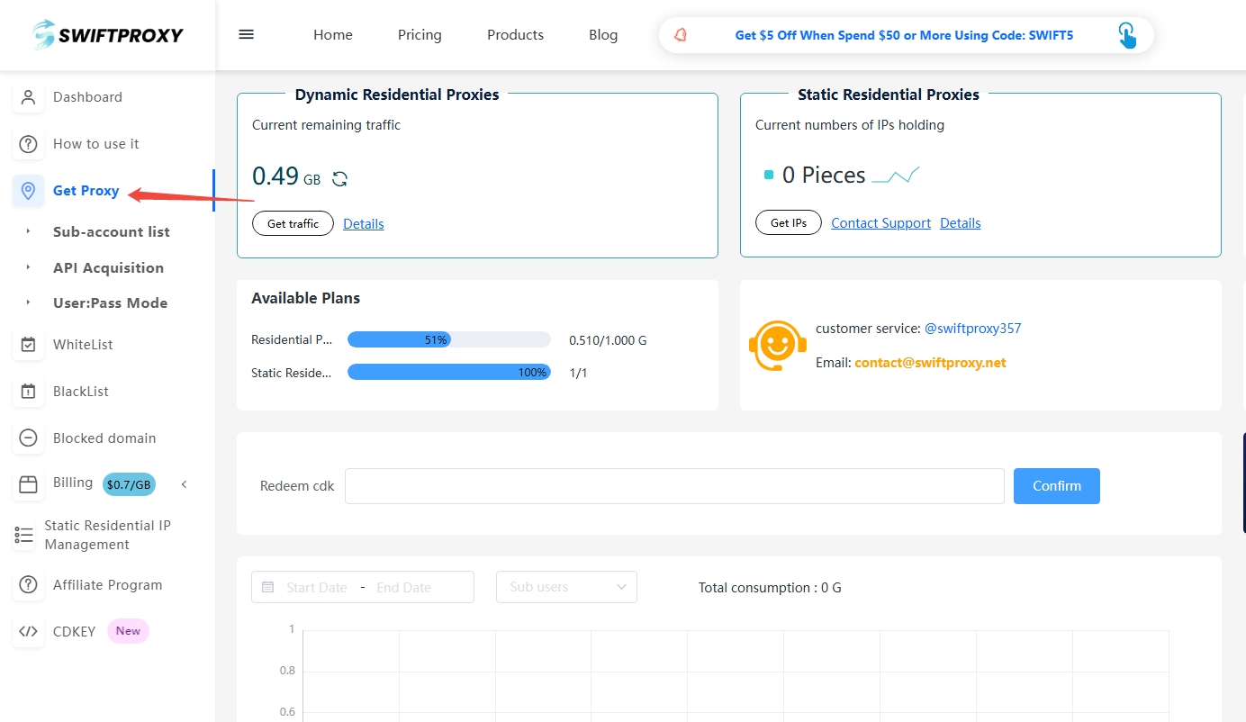 Allez dans le Centre Utilisateur Swiftproxy, le tableau de bord principal où vous gérez vos services de proxy, puis cliquez sur la section "Get Proxy". 👉 Entrer dans le Centre Utilisateur