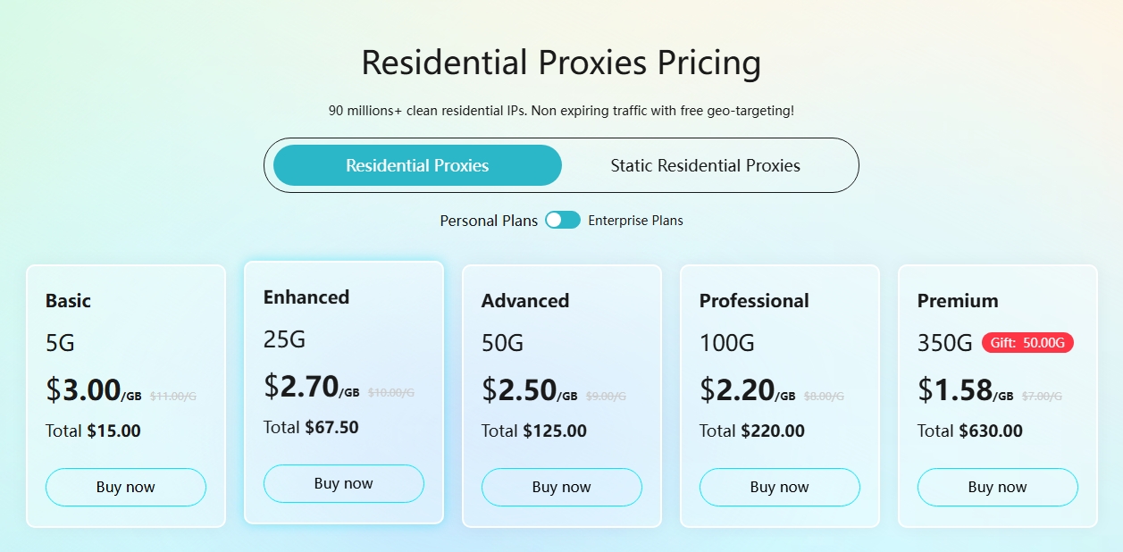 Swiftproxy propose des forfaits de proxies résidentiels flexibles adaptés aux utilisateurs de toutes tailles — des particuliers aux entreprises. Vous pouvez choisir un forfait en fonction de vos besoins en trafic, de vos objectifs d’utilisation, ou demander une solution personnalisée. Cette page présente nos options tarifaires disponibles et ce à quoi vous pouvez vous attendre pour chacune.