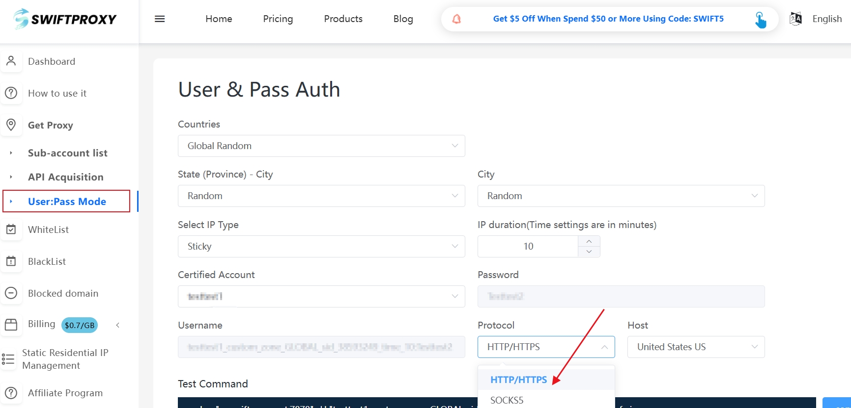 Dans “User and Pass Auth”, sélectionnez “HTTP/HTTPS” comme protocole lors de la configuration du proxy.