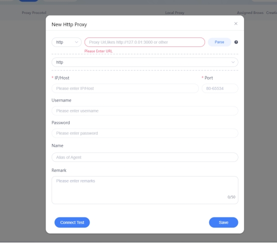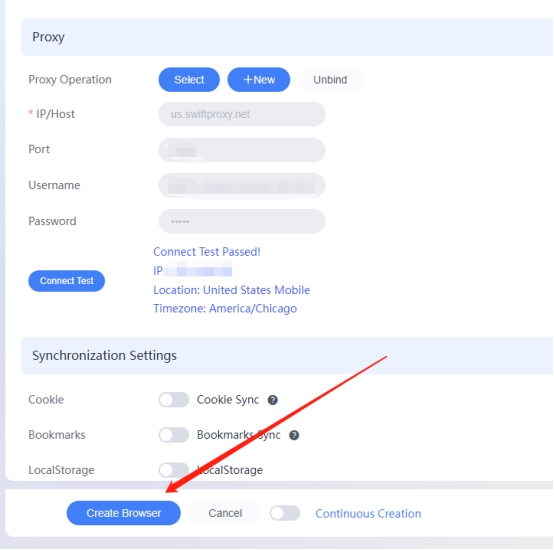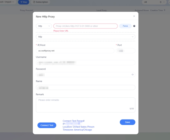 Copy your credentials from the Swiftproxy dashboard to ClonBrowser as shown below, then hit “Save” at the bottom right corner. You may tap the “Connect Test” to check if the proxy is set up successfully. Note: You can find the required proxy details in Step 1.