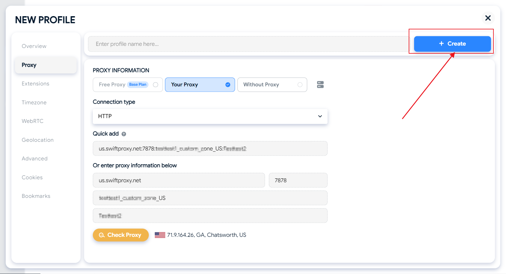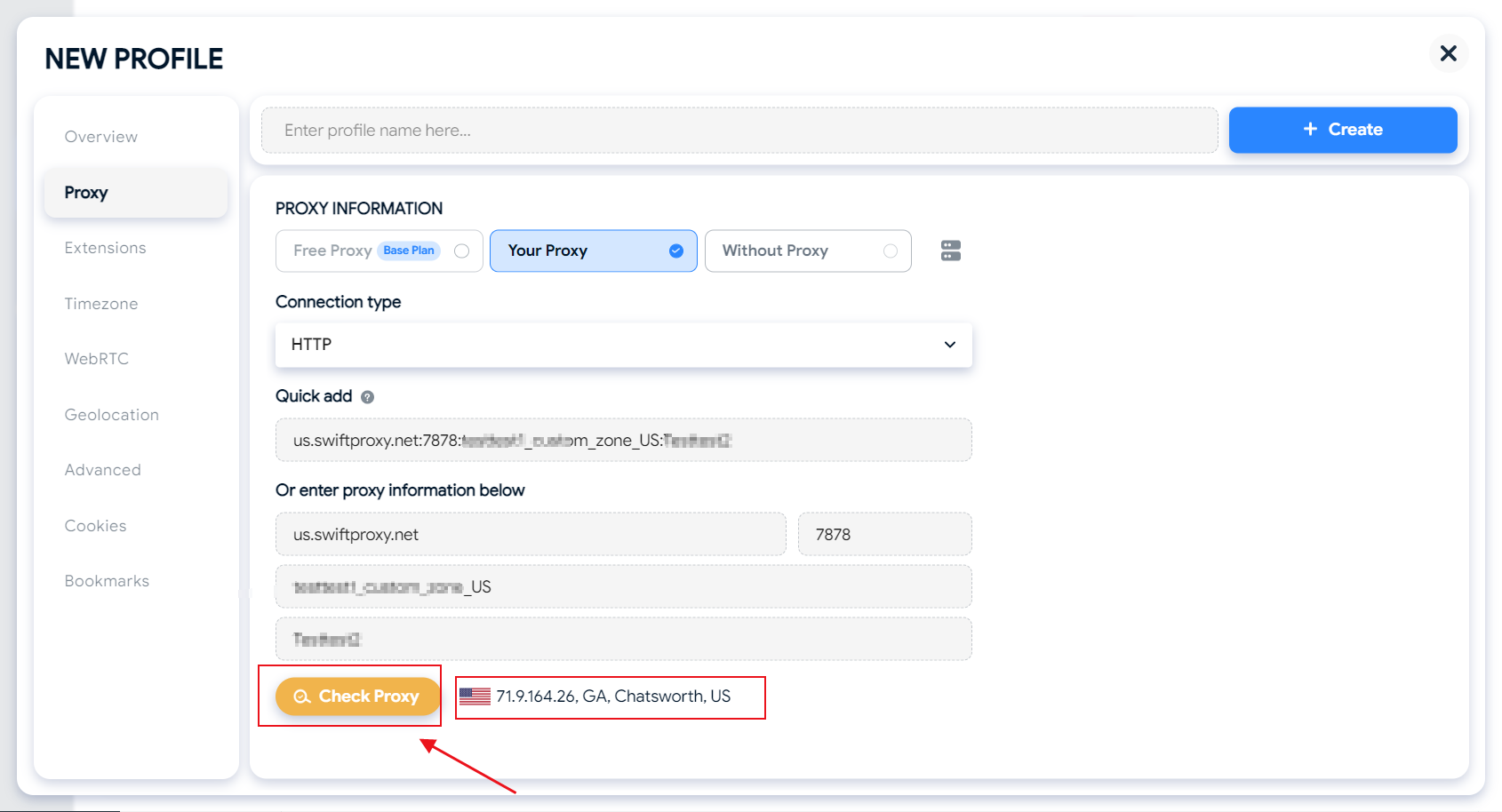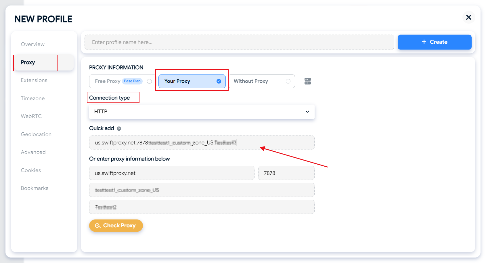 Enter the proxy settings page. Select "Your Proxy", and keep the Connection type consistent with the generated proxy protocol. Paste the proxy information just generated in "Quick add" and press Enter to automatically fill in the options below. Note: You can find the required proxy details in Step 1.