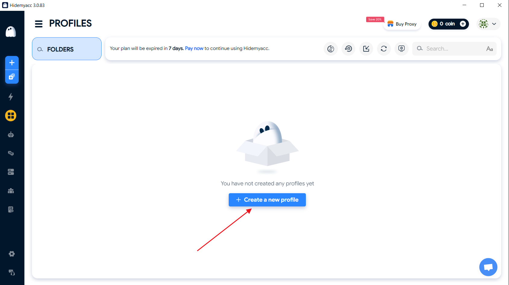 Open HideMyAcc for the first time, log in, and click "Create a new profile".