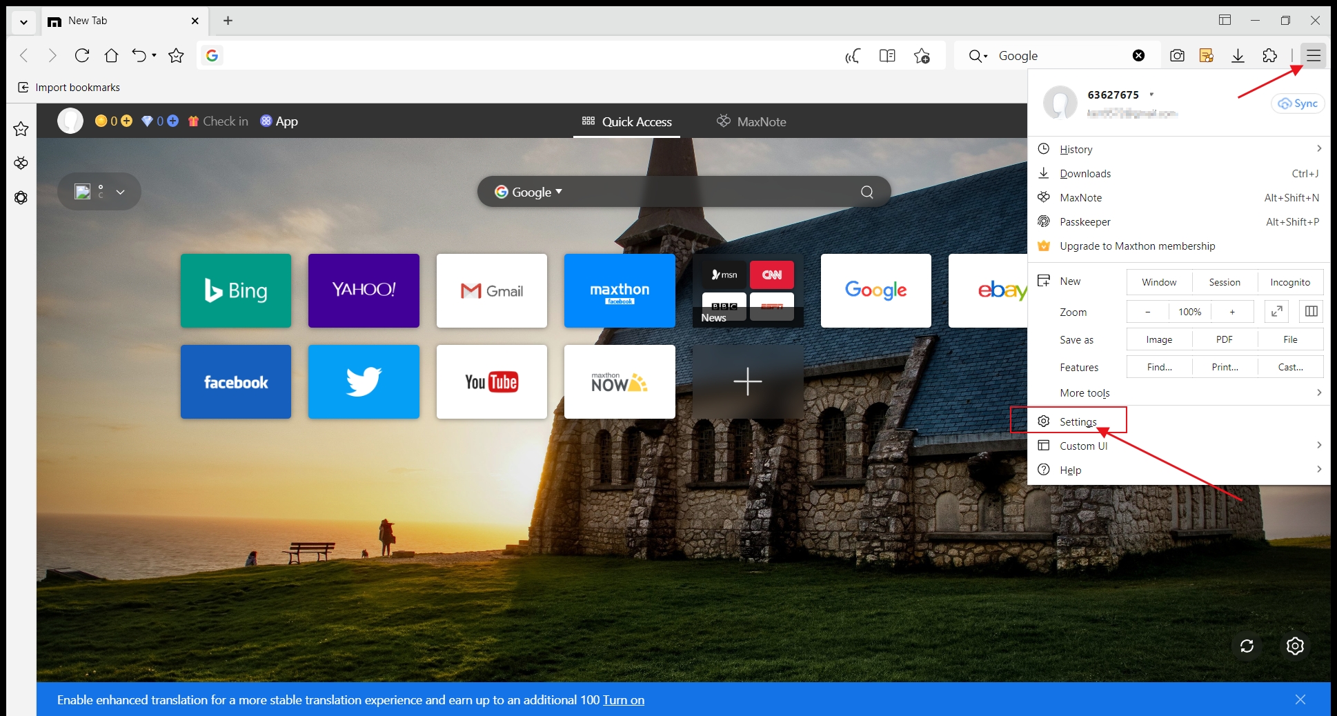 Open Maxthon, click the menu in the upper right corner, and select "Settings".