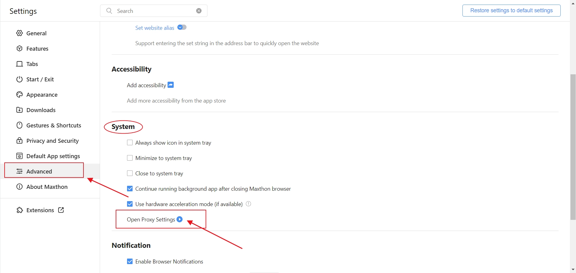 Select "Advanced". Scroll down to the "System" section and click "Open Proxy Settings" to jump to the system settings page.