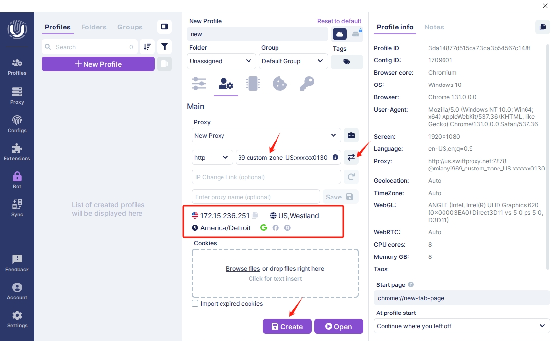 To configure your proxies, select HTTP as the proxy protocol to run with. In the adjacent field, Paste Username, Password, Hostname, and Port we copied from Swiftproxy dashboard. A special button will allow you to quickly check the functionality of the proxy. If the proxy is valid, click "Create" at the end.