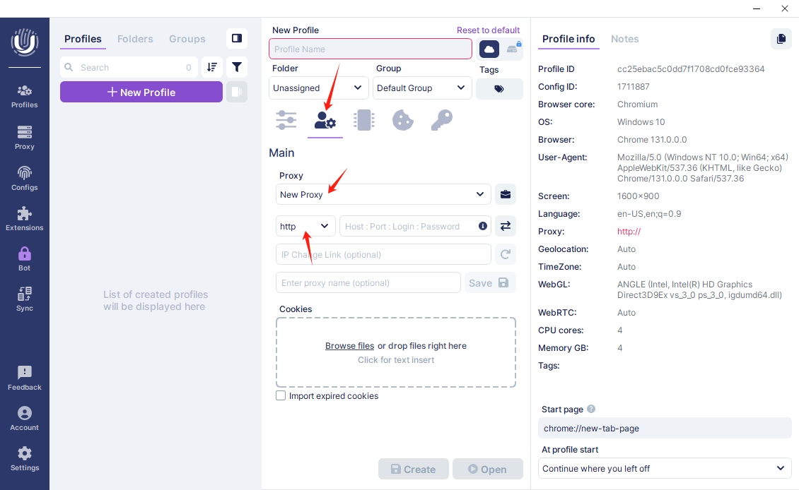 A window for profile configuration will pop up. Select the “Main” tab. In the proxy section, click the dropdown list and select “New Proxy", then select the appropriate proxy protocol. In this case, we will choose the "HTTP" protocol.