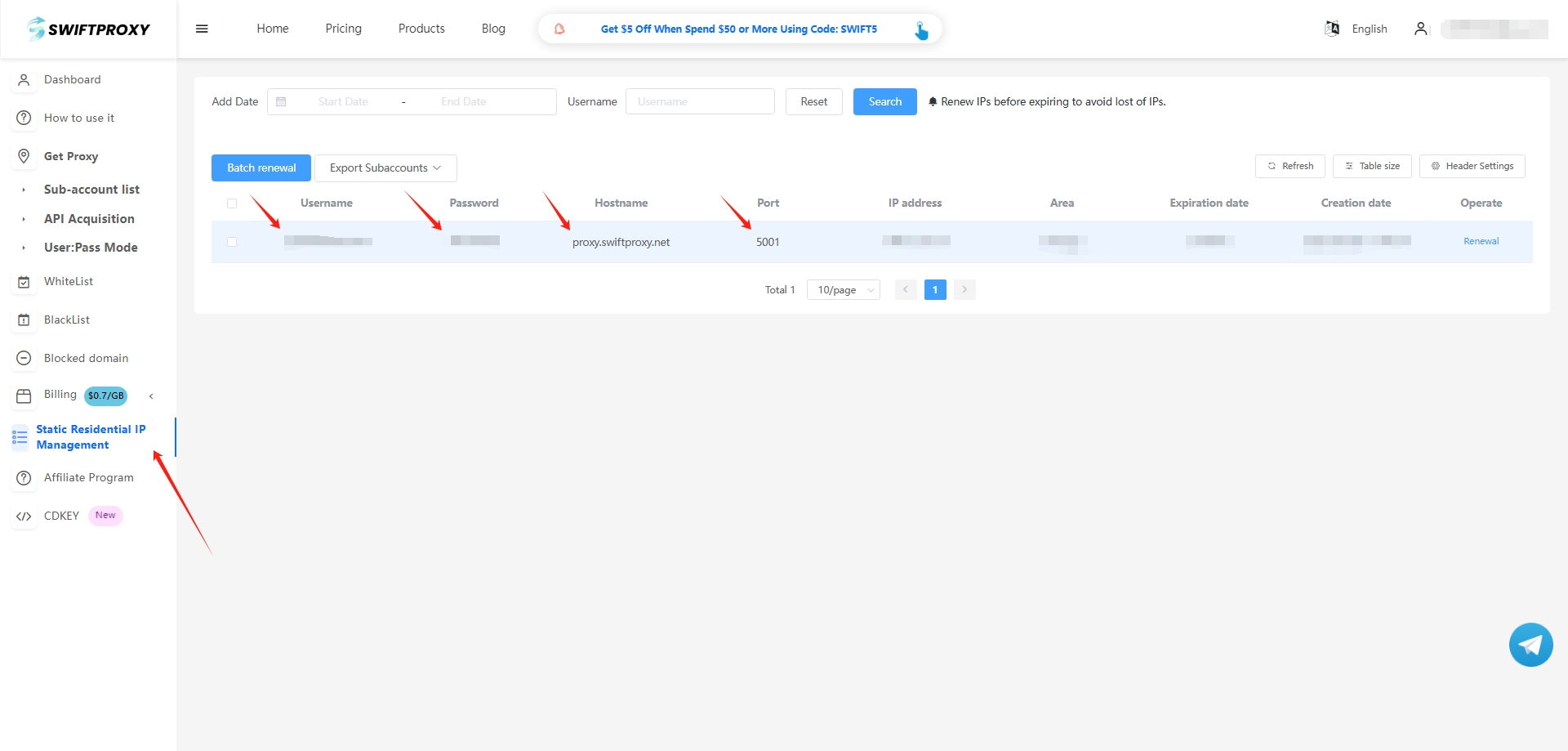 Visit the Swiftproxy dashboard and copy Username, Password, Hostname, and Port.