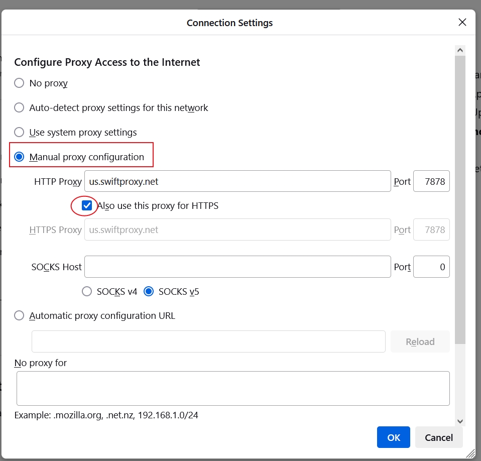 In "Connection Settings", select "Manual proxy configuration", then fill in the HTTP or SOCKS Username, Password, Hostname, and Port by Swiftproxy, and check "Also use this proxy for HTTPS" or check "Also use this proxy for SOCKS".