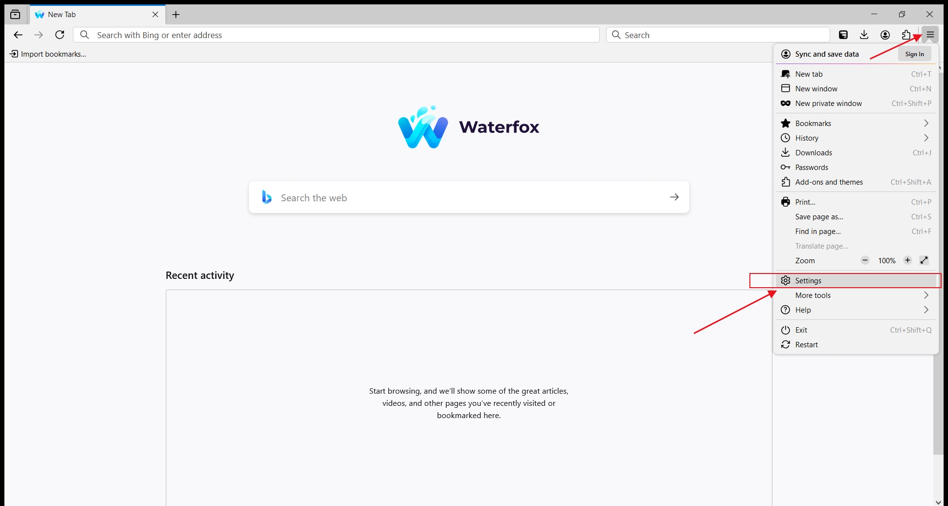 Open Waterfox, click the menu in the upper right corner, and select "Settings".