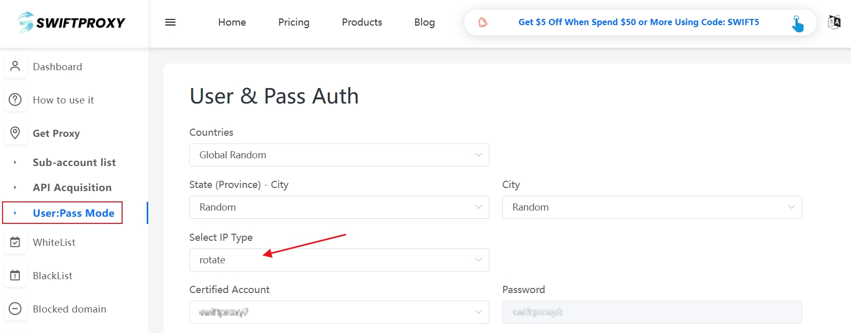 Click "Get Proxy" in "User and Pass Auth", set Select IP Type to "rotate".