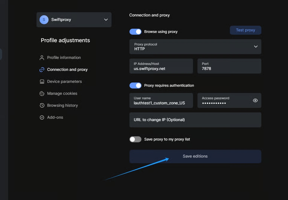 要配置您的代理,請貼上用戶名、密碼、服務器名和端口 重要提醒:在 Lauth 的代理設定中貼上代理字串後,還需要手動再次輸入代理地址。 例如,若您的代理位置設定為美國,則需在紅色欄位中將【swiftproxy.net】改為【us.swiftproxy.net】