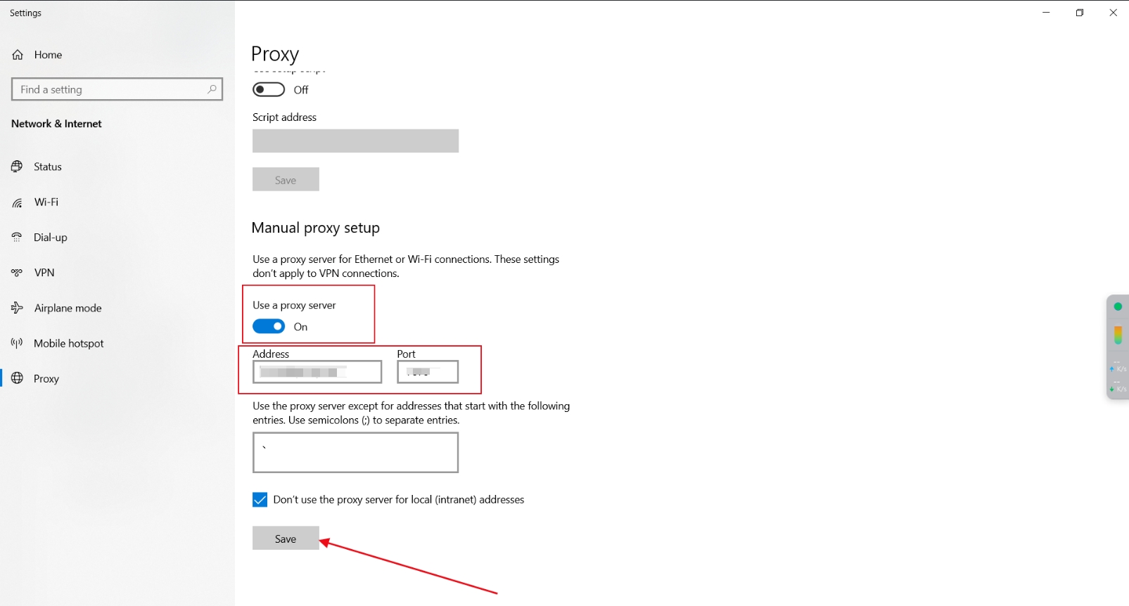 開啟【Use a proxy server】按鈕,輸入剛剛從 Swiftproxy 用戶中心複製的用戶名、密碼、服務器名和端口,然後點擊【Save】