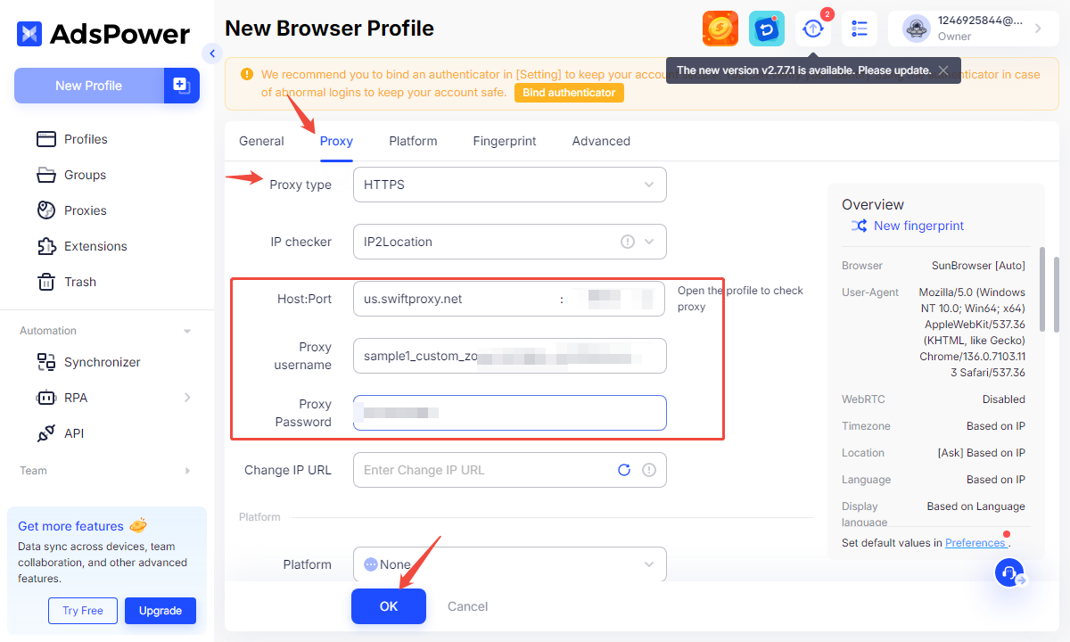 Step 2: 在 Adspower 中配置 Swiftproxy